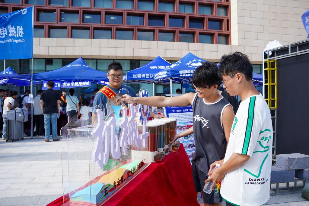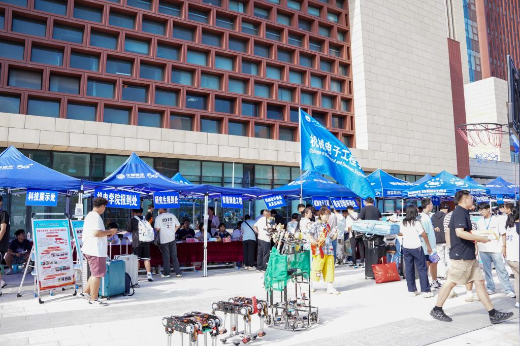 學(xué)院迎新點(diǎn)以“‘五’力全開,育大國‘機(jī)械+’”為主題,特別設(shè)置“五”力賦能儀式,五種顏色的彩砂分別對應(yīng)“引領(lǐng)力、源動(dòng)力、躬行力、靈動(dòng)力、融合力”(學(xué)院“五維育人”核心能力),新生在志愿者引導(dǎo)下將彩砂傾倒入“機(jī)械+”能量倉內(nèi),寓意“五力”從此刻起融入成長血脈。此外,學(xué)院迎新點(diǎn)的科技展示處的機(jī)器人更是吸引了眾多新生的目光,小平科技創(chuàng)新團(tuán)隊(duì)成員們?yōu)樗麄兗?xì)心講解,每一部投籃機(jī)器人、仿生足式機(jī)器人的背后都凝結(jié)著機(jī)電學(xué)子的心血,在新生的心中悄然種下“科創(chuàng)”的種子。