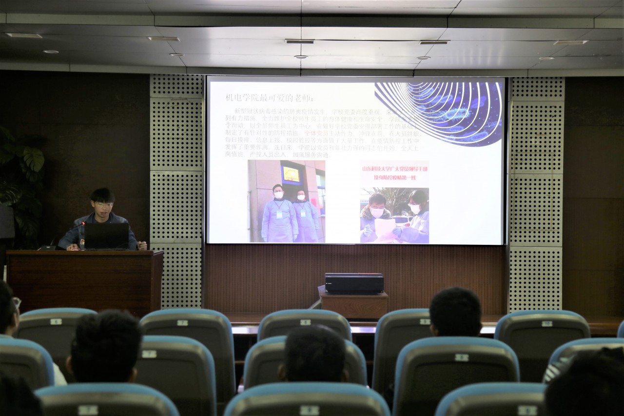 王正江介紹了機電學(xué)院師生在疫情期間為學(xué)校、社區(qū)疫情防控進(jìn)行的各項工作,特別講述了機電學(xué)子在疫情期間積極參加各項志愿服務(wù)活動的優(yōu)秀事跡,通過分享自身暑假時間到臨沂市蒙陰縣參加了“三下鄉(xiāng)”社會實踐活動,采訪當(dāng)?shù)毓矙C關(guān)、社區(qū)網(wǎng)格化工作人員的所聞所感,向與會同學(xué)呈現(xiàn)了青年學(xué)子在疫情當(dāng)中不畏艱險、共克時艱的精神。