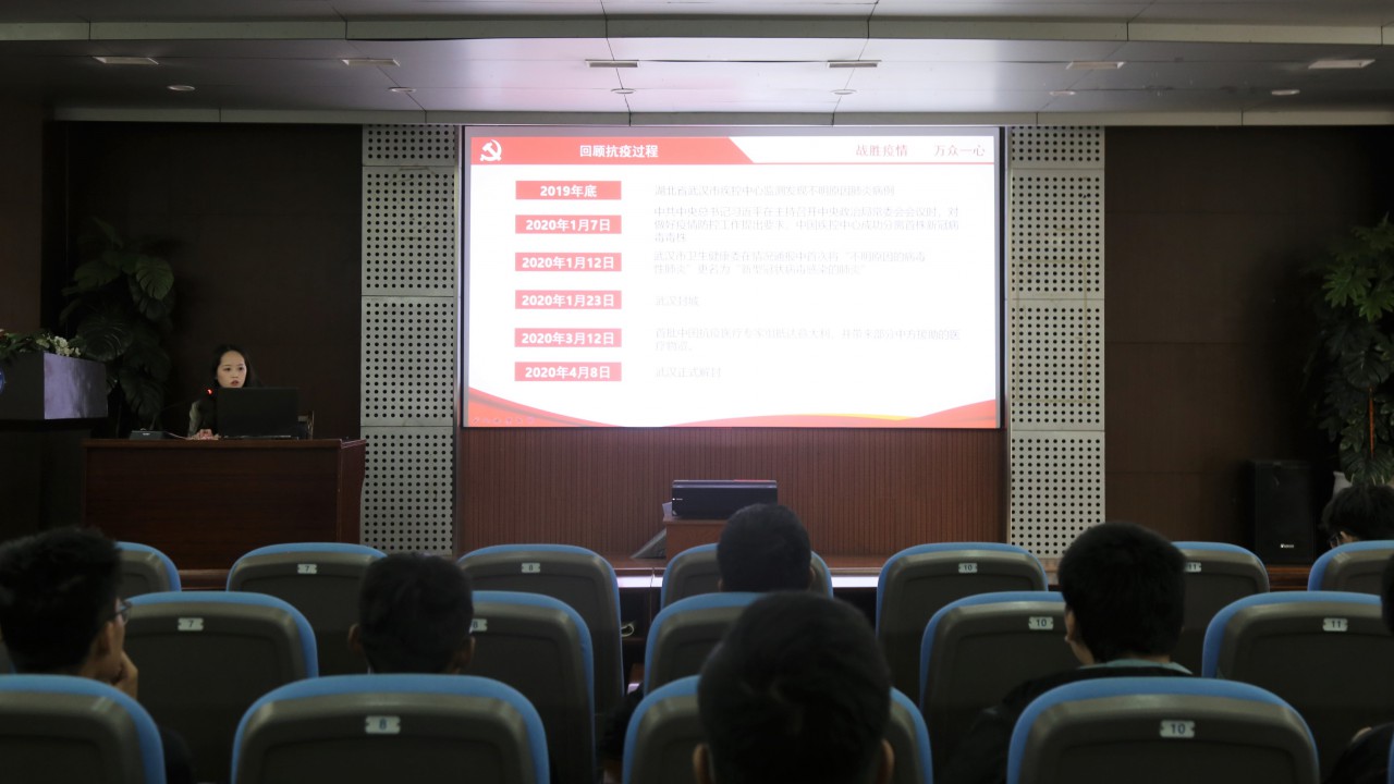 會上,張露從回顧抗疫過程、青島速度、中美抗疫過程的對比和抗疫中的人物事跡四個方面介紹了中國在抗疫過程中涌現(xiàn)的“舍小家 顧大家”的奉獻(xiàn)精神,并結(jié)合自身在疫情期間主動報名參與當(dāng)?shù)?/span>疫情防控志愿服務(wù)的經(jīng)歷向同學(xué)們介紹了社區(qū)疫情防控的工作內(nèi)容與職責(zé)、志愿者的辛勞與擔(dān)當(dāng),直觀展現(xiàn)了基層疫情防控工作中青年人奮斗的姿態(tài)和取得的戰(zhàn)果。