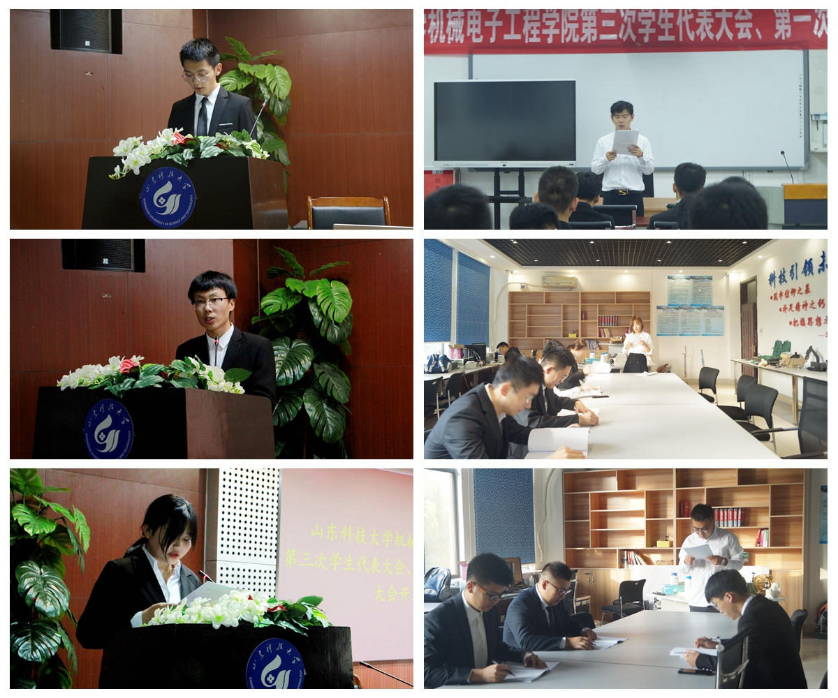 程龍作機(jī)械電子工程學(xué)院學(xué)生會工作報告;郭雷作機(jī)械電子工程學(xué)院研究生會工作報告;王金峰宣讀《關(guān)于<山東科技大學(xué)機(jī)械電子工程學(xué)院學(xué)生會章程>(修正案)的說明》;石兆婷宣讀《山東科技大學(xué)機(jī)械電子工程學(xué)院研究生會章程(草案)》;許楠作《山東科技大學(xué)機(jī)械電子工程學(xué)院第三次學(xué)生代表大會提案工作報告》;劉國慶作《山東科技大學(xué)機(jī)械電子工程學(xué)院第一次研究生代表大會提案工作報告》。