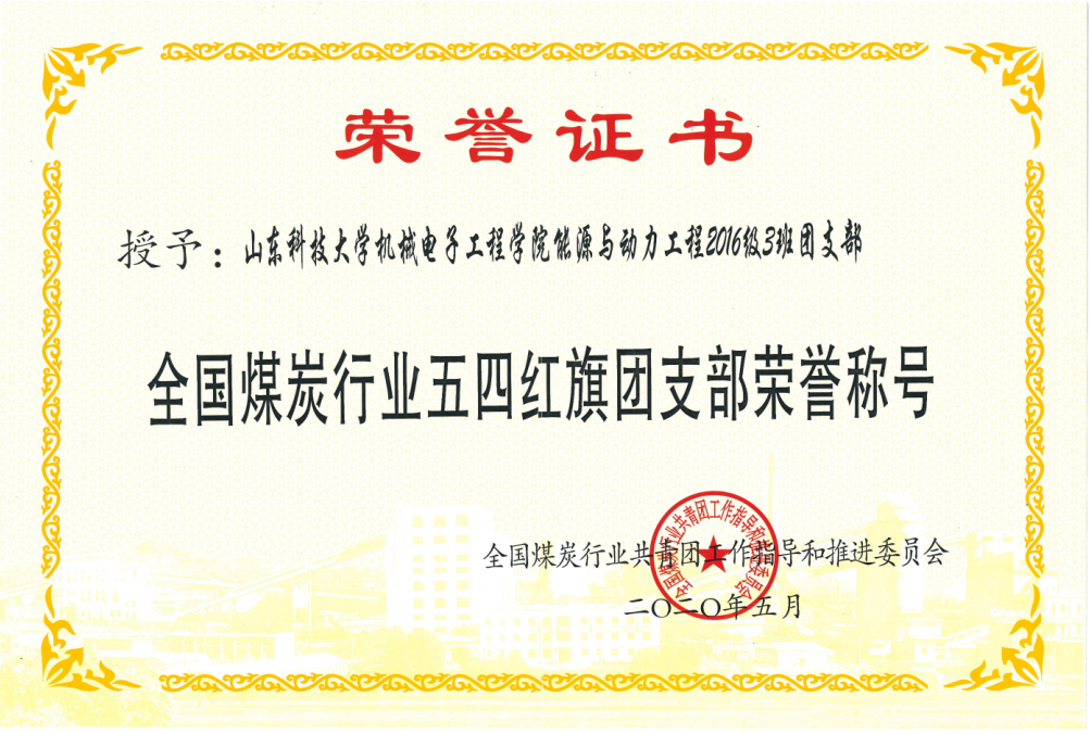 點擊:日前,全國煤炭行業(yè)共青團(tuán)工作指導(dǎo)和推進(jìn)委員會對2019年度全國煤炭行業(yè)優(yōu)秀團(tuán)委(團(tuán)支部)、團(tuán)干部和共青團(tuán)員進(jìn)行了表彰,山東科技大學(xué)機(jī)械電子工程學(xué)院能源與動力工程2016級3班團(tuán)支部榮獲“全國煤炭行業(yè)五四紅旗團(tuán)支部”稱號。