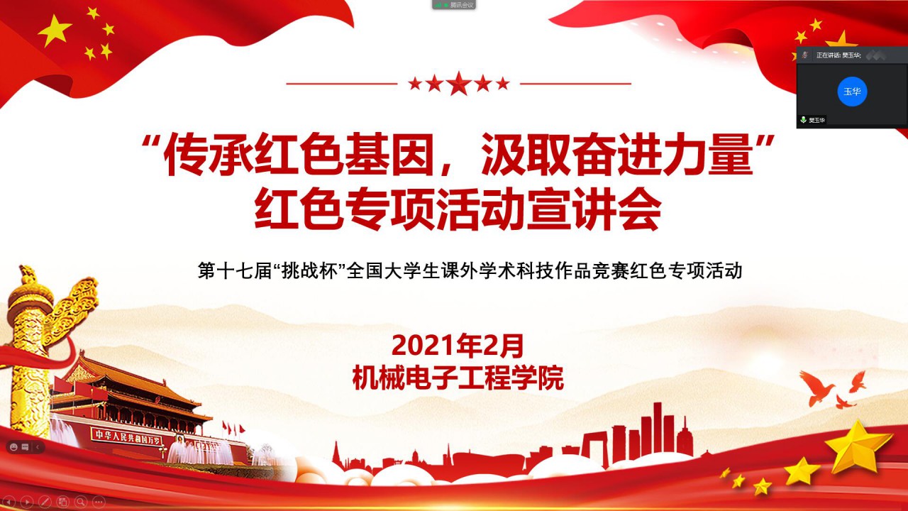 點(diǎn)擊:為迎接中國(guó)共產(chǎn)黨建黨100周年,傳承紅色基因,引導(dǎo)學(xué)生在實(shí)踐中接受紅色教育,2月20日,機(jī)械電子工程學(xué)院積極響應(yīng)“挑戰(zhàn)杯”競(jìng)賽組員會(huì)和學(xué)校的號(hào)召,舉辦了“傳承紅色基因,汲取奮進(jìn)力量”紅色專(zhuān)項(xiàng)活動(dòng)宣講會(huì)。機(jī)電學(xué)院團(tuán)委書(shū)記樊玉華,團(tuán)委老師王玉鵬出席了此次會(huì)議,全體團(tuán)支部書(shū)記及各社會(huì)實(shí)踐項(xiàng)目負(fù)責(zé)人參加,宣講會(huì)由團(tuán)委老師苗成旭主持。