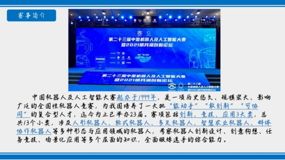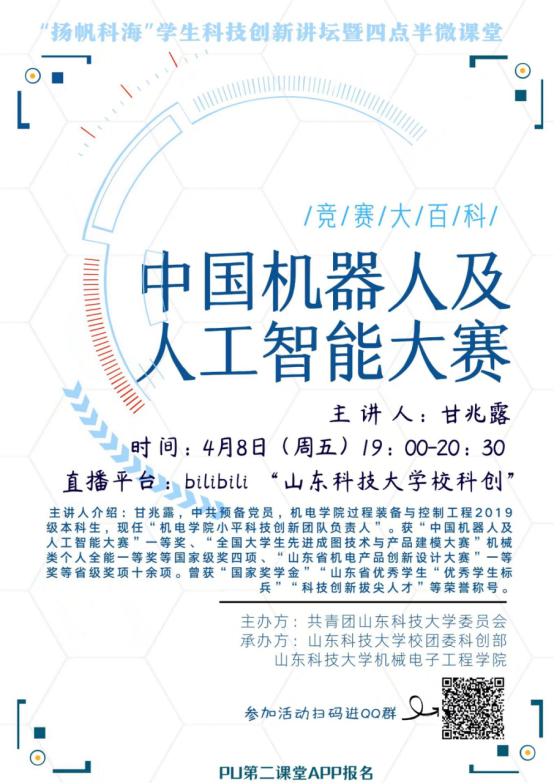 點擊:為了激發(fā)同學(xué)們的科技創(chuàng)新熱情,豐富相關(guān)專業(yè)知識和經(jīng)驗,4月8日晚上,機電學(xué)院以直播形式舉辦“中國機器人及人工智能大賽”專題講座。曾獲得該賽事一等獎、小平科技創(chuàng)新團(tuán)隊負(fù)責(zé)人甘兆露擔(dān)任主講人。