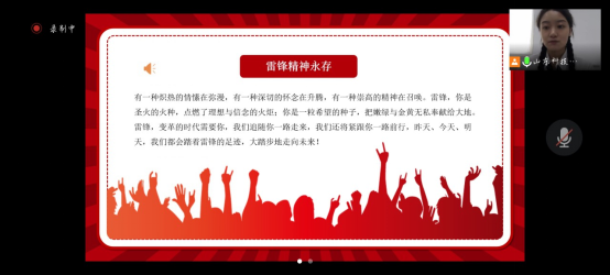 李菲向孩子們宣講雷鋒故事,她從雷鋒的生平、紀(jì)念日的來歷、名言錄以及如何學(xué)習(xí)雷鋒精神等多個(gè)方面介紹了雷鋒精神。李菲鼓勵(lì)孩子們在學(xué)習(xí)上要學(xué)習(xí)雷鋒的“釘子精神”,刻苦鉆研,在生活中學(xué)習(xí)雷鋒助人為樂的品質(zhì),樂于助人。最后,在孩子們《學(xué)習(xí)雷鋒好榜樣》的悠揚(yáng)歌聲中,線上宣講活動(dòng)結(jié)束。