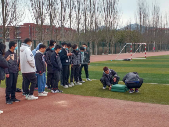 “我來教大家打軍體拳!大家跟我做!”幾天后,退伍老兵們發(fā)現(xiàn)部分學生因常待宿舍無精打采,為了增強同學們的身體素質(zhì),提高免疫力,嚴利君結(jié)合在部隊學習到的科學訓練方法組織同學們在高地操場進行軍體拳、俯臥撐、深蹲、慢跑等一系列的體育鍛煉。吳彪、袁龍則在操場上為同學們講解示范疊軍被,引導同學們做好內(nèi)務整理與統(tǒng)一,確保宿舍環(huán)境清潔規(guī)整,幫助同學們樹立正確的學習和生活態(tài)度。張鵬等退伍老兵積極響應國防先鋒營的志愿者活動,脫下迷彩服,換上防疫服,在核酸檢測現(xiàn)場維持現(xiàn)場秩序,保證檢測工作的有序進行。