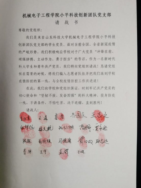 抗擊疫情,勠力同心。疫情突然襲來,學(xué)校、學(xué)院疫情防控嚴(yán)峻,小平科技創(chuàng)新團隊黨支部全體在校黨員第一時間集體請戰(zhàn),鄭重簽下請戰(zhàn)書,用自己的實際行動踐行了共產(chǎn)黨員的使命與擔(dān)當(dāng),成為校園疫情防控中最美的一抹紅色。