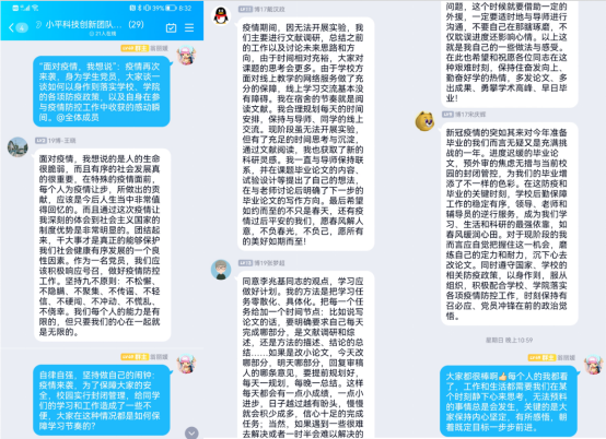 依托QQ群,支部全體黨員紛紛暢談收獲與感動。圍繞“抗疫”中如何踐行黨員責(zé)任與擔(dān)當(dāng)談心得,圍繞自身參與疫情防控工作經(jīng)歷談感動瞬間,圍繞校園封閉管理下的堅持科研談感想。